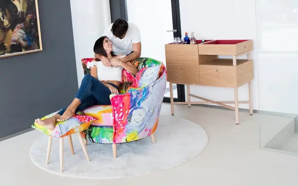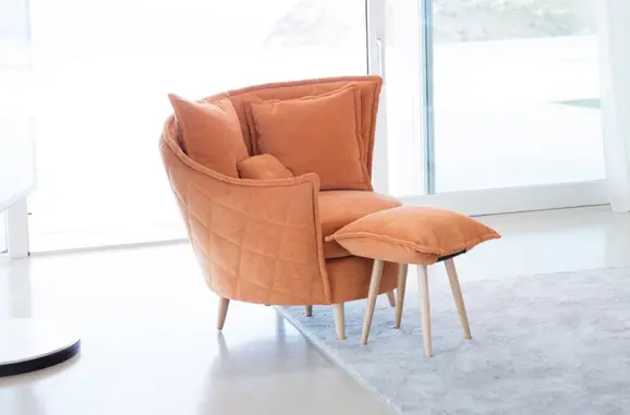 Le design se complète avec un pouf très léger qui se transforme en table basse en un clin d’œil.