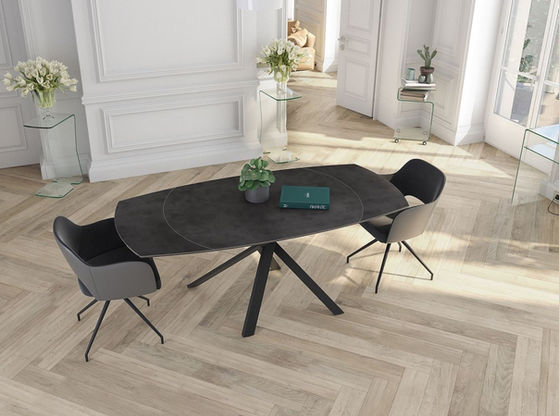 La table Kheops est une table de repas modulable. Fermée, elle mesure 130cm par 100cm. Ouverte, elle s'allonge jusqu'à 190cm. Son plateau est en céramique Havane, une couleur dont la teinte est un mélange de gris et de marron, celle-ci se situe entre l’acier et l’argile. La céramique est collée sur un verre de 8mm afin de donner au plateau une excellente résistance. Son piétement est en acier laqué avec un design unique et irrésistible. Il vous suffit de pivoter le plateau central pour faire sortir les deux rallonges logées en dessous.